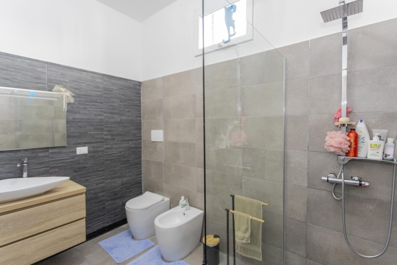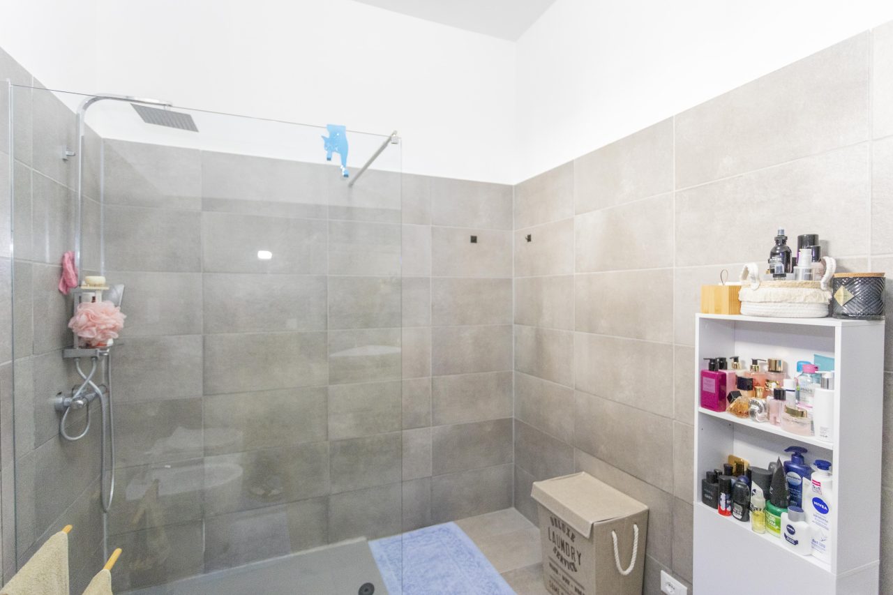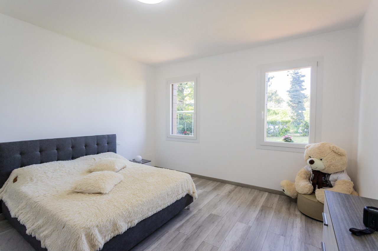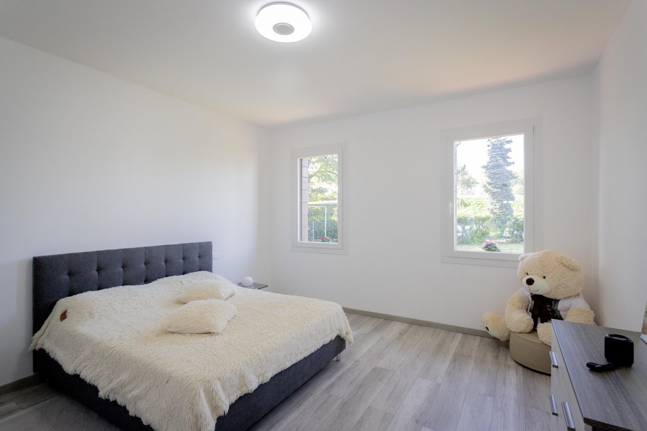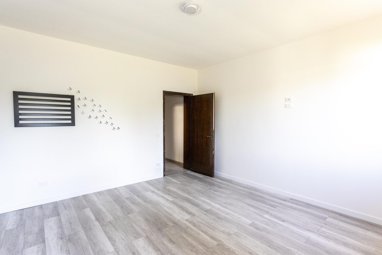 La zona notte è composta da tre generose camere matrimoniali; particolarmente interessante è la camera principale dotata di cabina armadio separata, offrendo spazio aggiuntivo indispensabile per ogni famiglia. Due bagni finestrati completano i profili della casa, entrambi equipaggiati con doccia.
