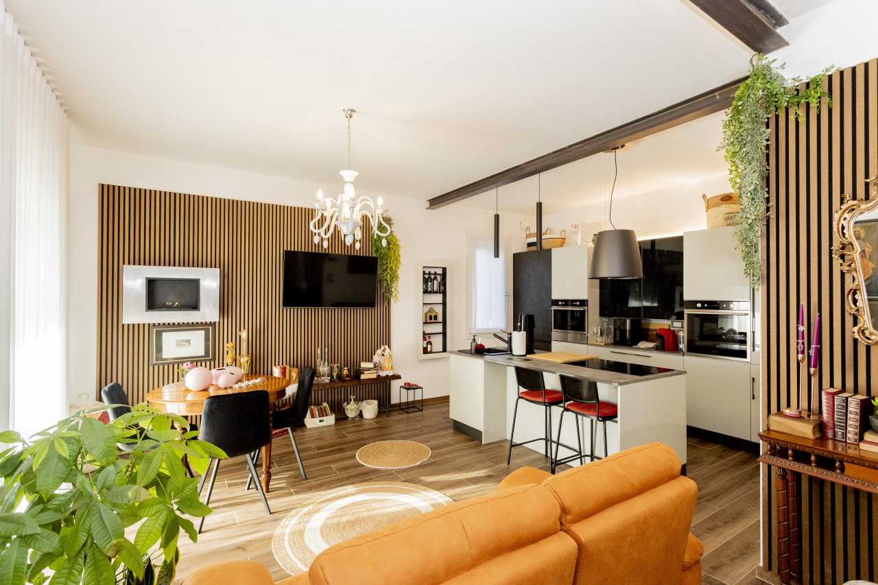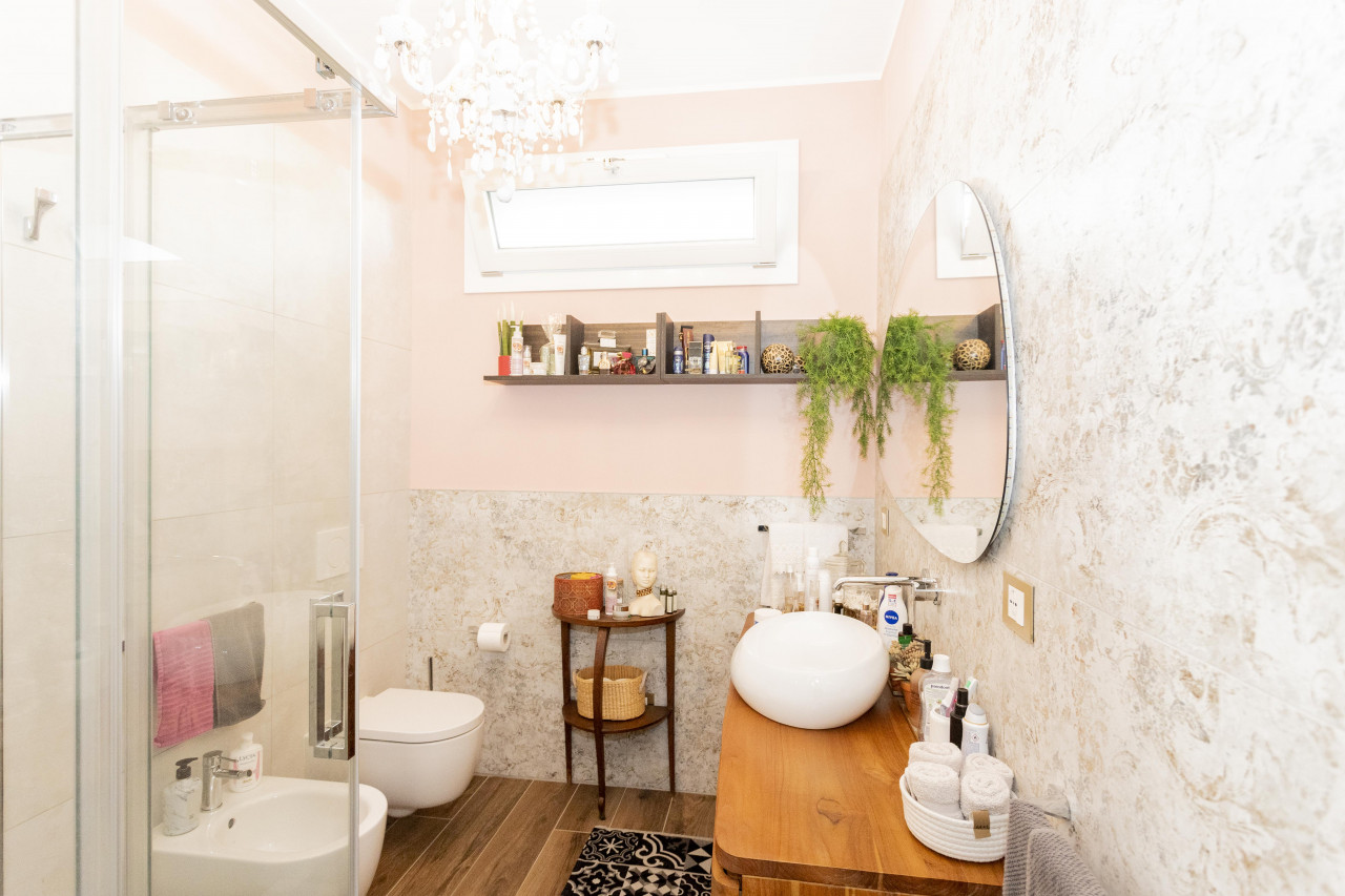 La zona giorno merita particolare attenzione; l’open space fra cucina e soggiorno crea un ambiente ampio perfetto per momenti conviviali in famiglia o durante cene con amici. I dettagli curati nell’arredamento rendono gli ambienti caldi ed invitanti, esaltati dal legno che decora sapientemente anche le pareti e regala un tocco moderno e di stile.