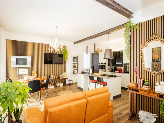 Un altro dei punti forti di questo immobile è il suo giardino di ca. 400 mq che circonda l’intera proprietà. Questo ampio spazio esterno offre infinite possibilità per creare un’oasi verde personalizzata. Immagina di poter godere di momenti di relax e tranquillità nel tuo giardino privato. Potrai rilassarti su una comoda amaca o prendere il sole su una sdraio, circondato da alberi e piante che offrono ombra e frescura. Questo spazio ti permetterà di staccare dalla vita quotidiana, creando un’atmosfera di pace e serenità. Inoltre, avrai la libertà di dare sfogo alla tua creatività e alle tue passioni. Se sei un appassionato di giardinaggio, potrai creare un meraviglioso angolo fiorito o coltivare un orto per godere di prodotti freschi e biologici direttamente dal tuo giardino. Se invece desideri uno spazio per trascorrere del tempo con gli amici e la famiglia, potrai allestire un’area barbecue o creare un’accogliente zona lounge all’aperto. Il giardino di questa casa ti offre la possibilità di vivere all’aperto in totale privacy. Potrai organizzare feste, cene o semplicemente goderti la tranquillità del verde circostante. Il tuo giardino sarà uno spazio dove potrai davvero fare quello che desideri, creando un ambiente che rispecchia i tuoi gusti e le tue esigenze. Ma ora vediamo com’è attualmente strutturata all’interno questa casa: l’immobile è diviso su due piani, al piano terra, troverai ingresso per accogliere gli ospiti. Subito dopo, c’è un soggiorno e una cucina separata.