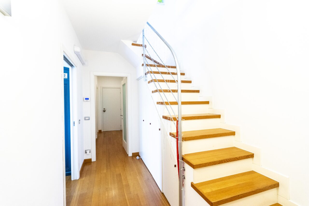 Scendendo al piano inferiore, la zona notte si sviluppa in tre camere da letto e due bagni, oltre a un comodo poggiolo. Ogni dettaglio è stato pensato per offrire funzionalità e benessere: serramenti con zanzariere, porta blindata e una disposizione degli spazi razionale e confortevole.