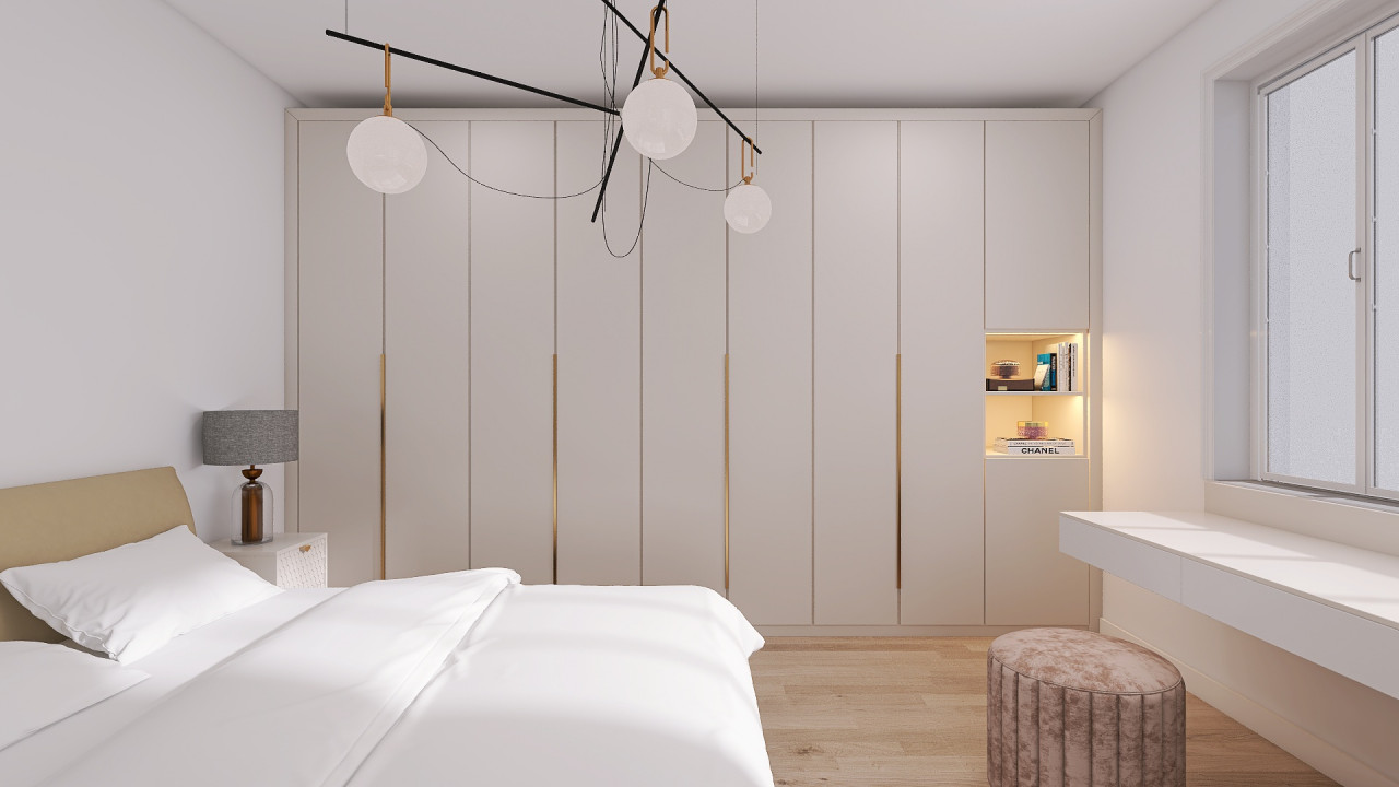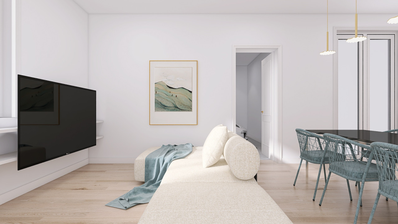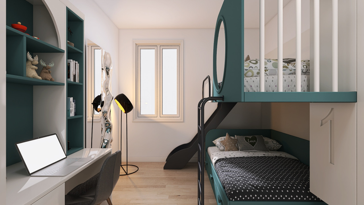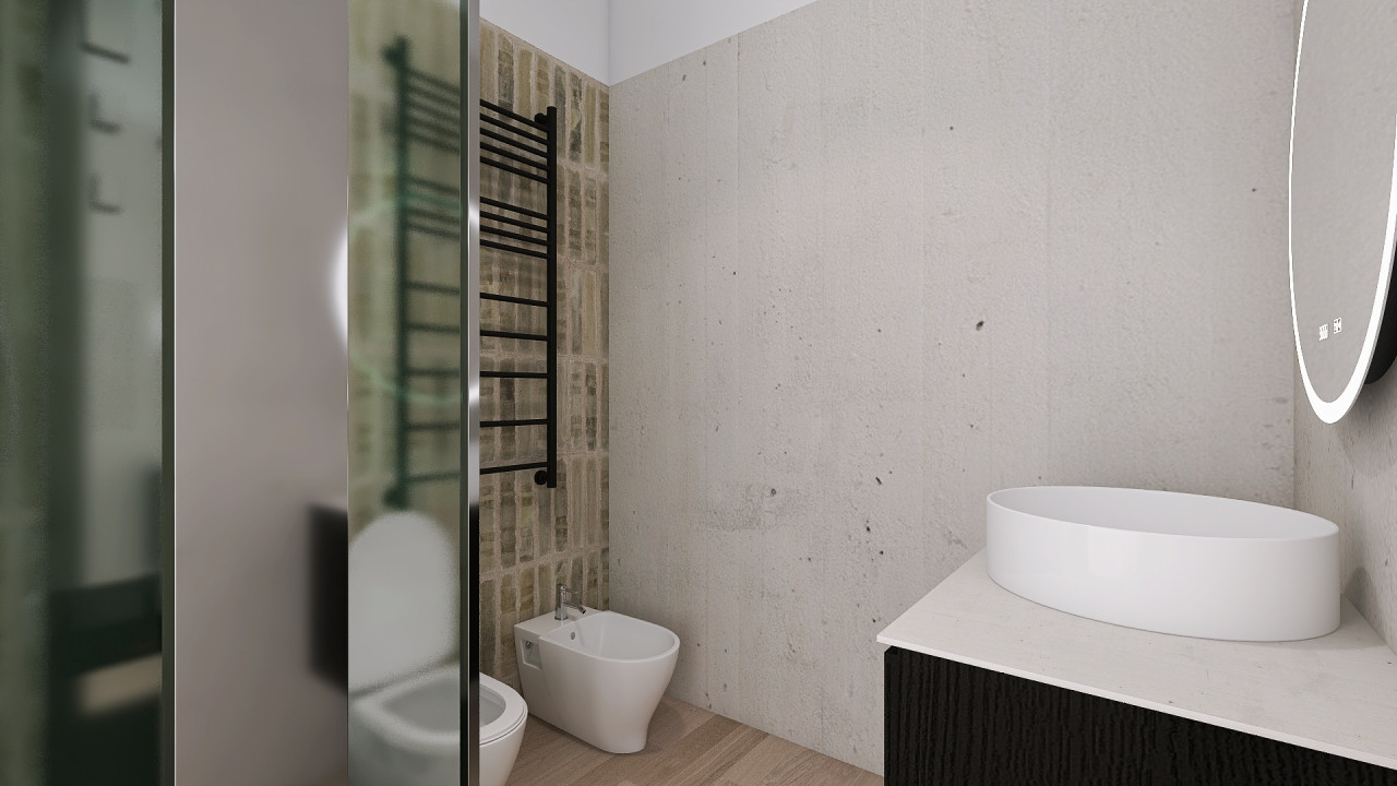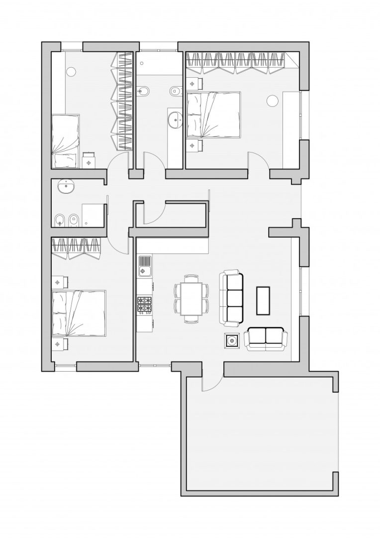 Internamente invece è composta da zona giorno open-space, bagno finestrato, camera matrimoniale, due camere di ca. 13 mq, ripostiglio e altro bagno.