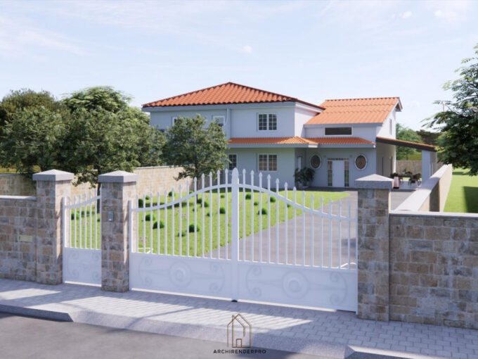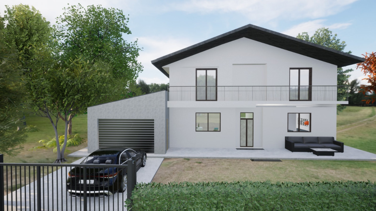 Questa porzione è disposta unicamente al piano terreno, è completamente indipendente con giardino esclusivo a cui si accede dagli ingressi pedonale e carraio sul fronte strada.